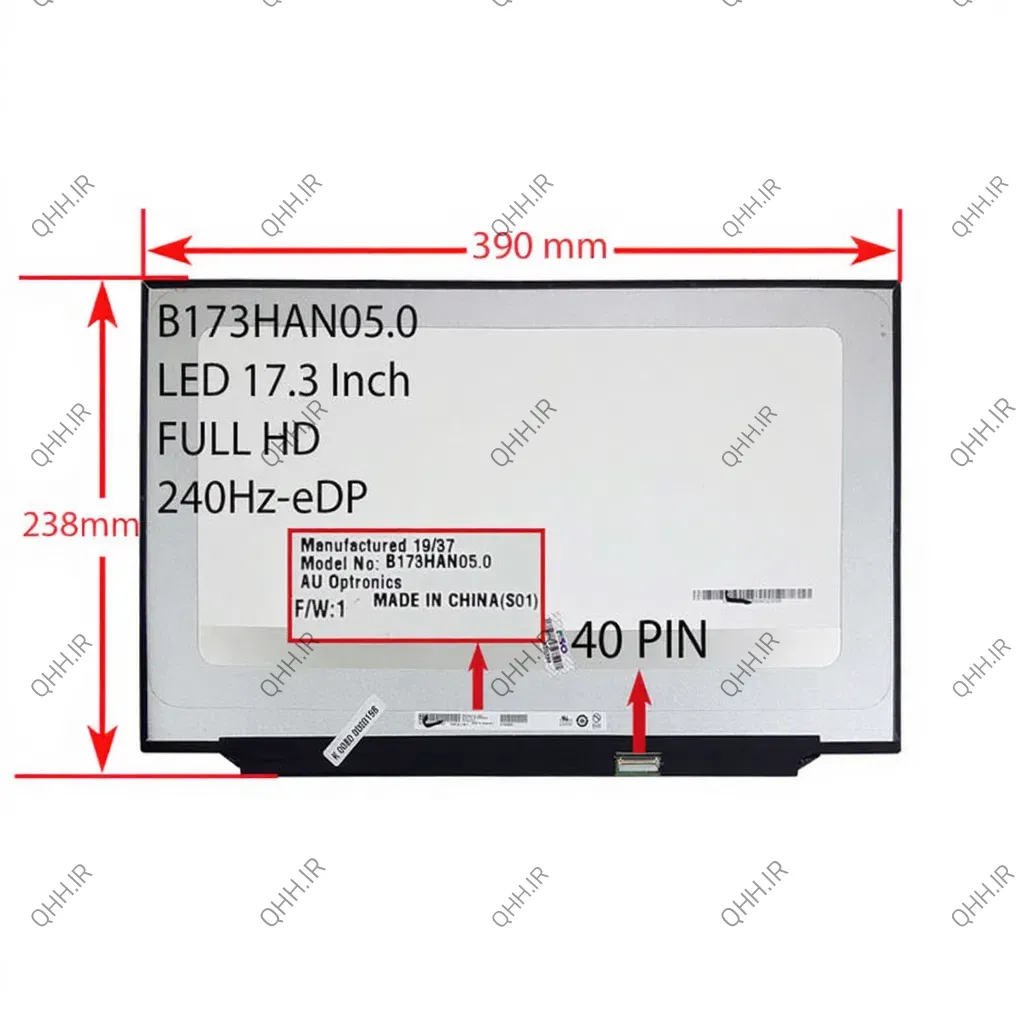 ال ای دی لپ تاپ 17.3 AUO B173HAN05.0 نازک مات 40 پین ریز FHD-IPS-EDP-240HZ بدون جاپیچ 390x238x3.5mm