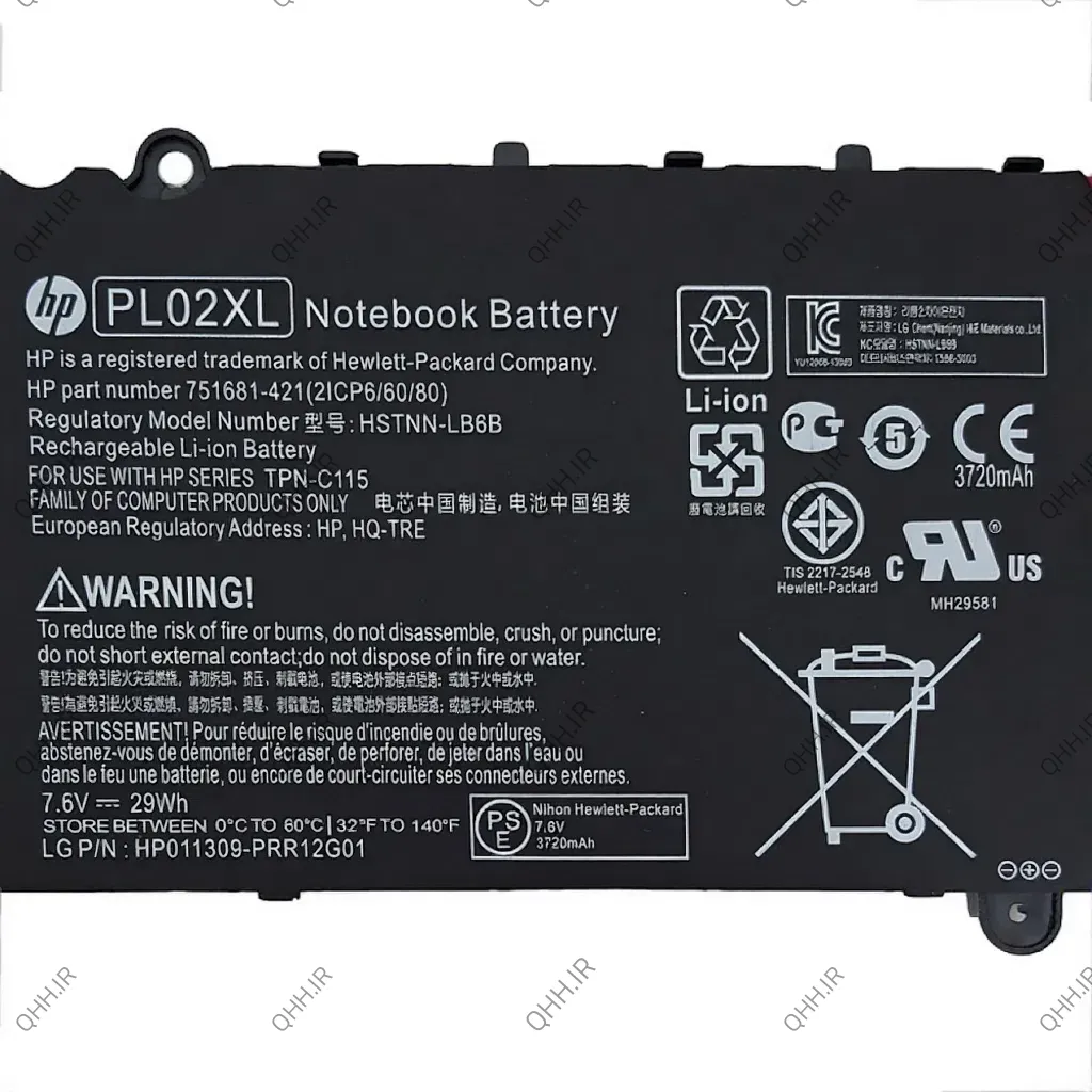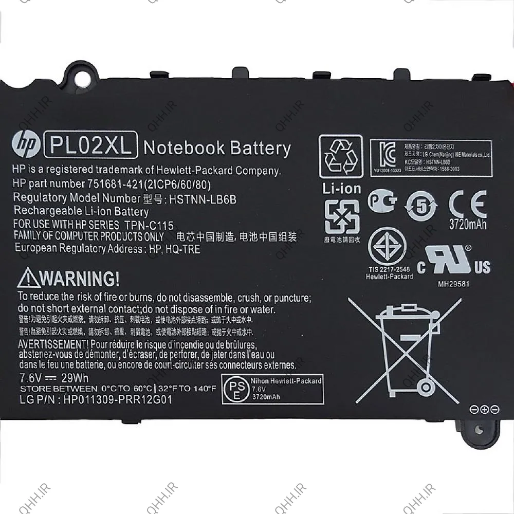برای تشخیص مدل باتری های برند HP میتوانید از Hstnn روی باتری که ترکیبی از 4 عدد و حروف است که روی تمام باطری های اچ پی ثبت شده است استفاده نمایید. این مشخصه در باتری های اینترنال به 6 عدد و حروف تغییر می کند. در این باتری اینترنال Hstnn بصورت PL02XL می باشد.