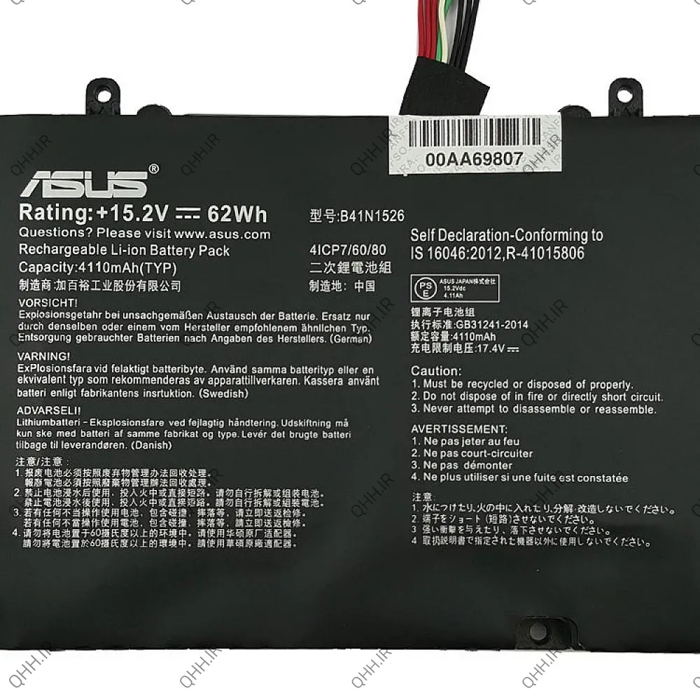 باتری اینترنال لپ تاپ ایسوس مدل GL502 دارای مشخصاتی مانند ولتاژ خروجی 15.2V ولت و ظرفیت 4110MA و توان خروجی 62WH است. هنگام خرید باطری های داخلی باید به جای خار و پیچ ها و نوع اتصال به مادربرد دقت کرد در بعضی از آنها سوکت روی باتری و در بعضی با سیم به مادربرد متصل می شود.