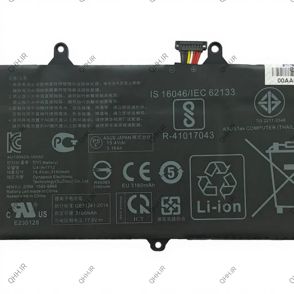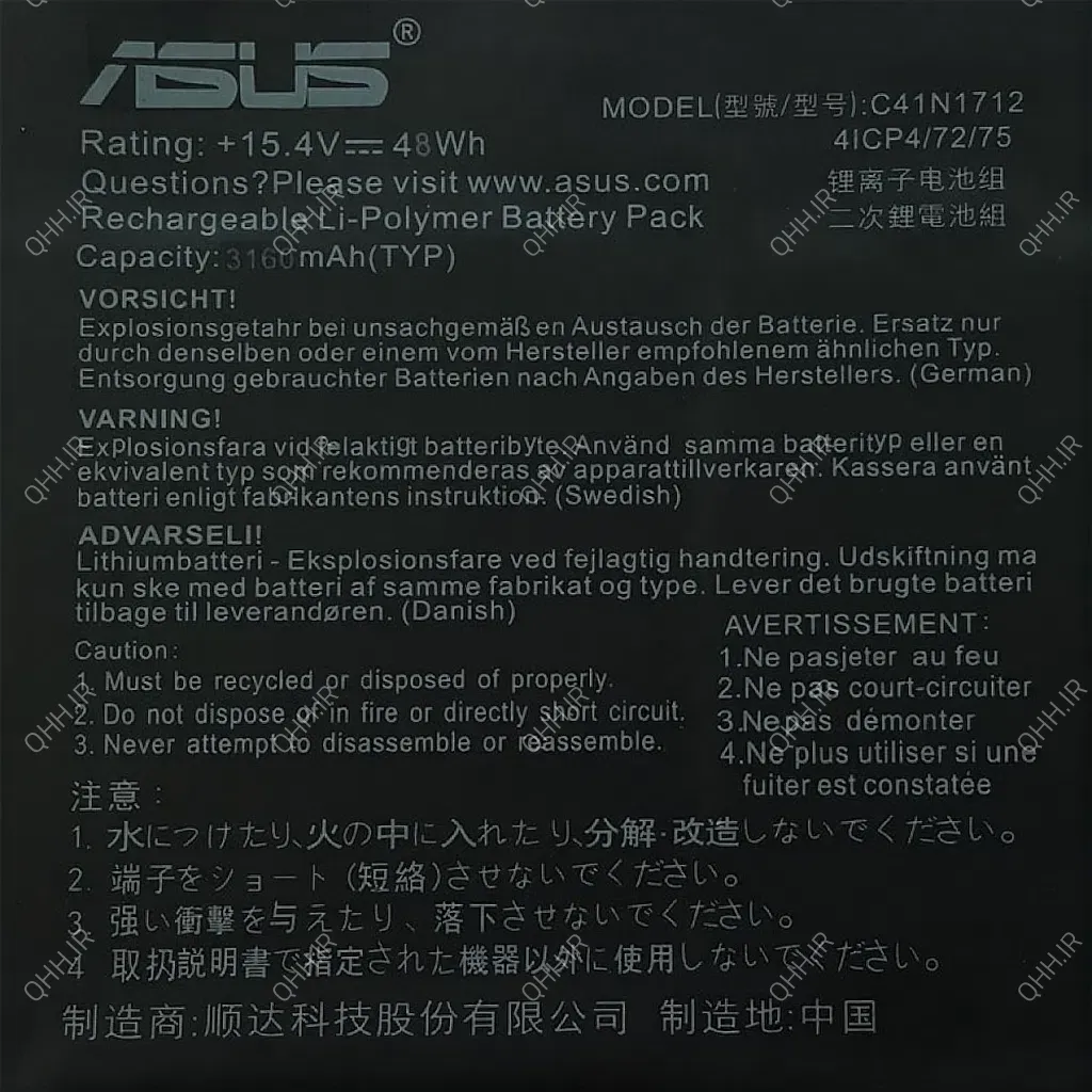 باطری لپ تاپ ایسوس GX501 یک باتری داخلی می باشد. این باتری مشخصاتی از قبیل ولتاژ خروجی 15.4V ولت و ظرفیت 3160mAh و توان خروجی 48WH دارد. در مورد باتری های داخلی دقت کنید که سوکت ممکن است روی باطری باشد یا با سیم به مادربرد متصل شود که این باتری با کابل به مادربرد متصل می شود. پارت نامبر این باتری به صورت C41N1712 می باشد.